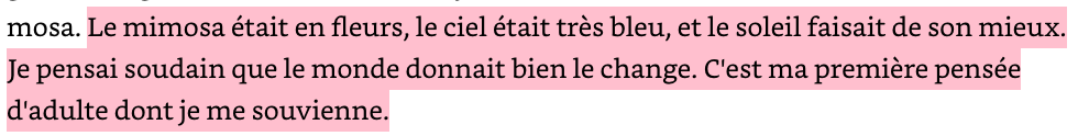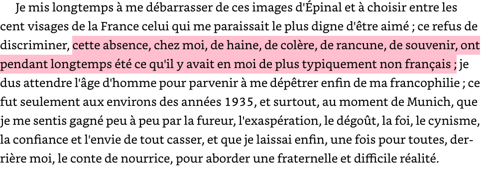 ce refus de discriminer, cette absence, chez moi, de haine, de colère, de rancune, de souvenir, ont pendant longtemps été ce qu'il y avait en moi de plus typiquement non français.