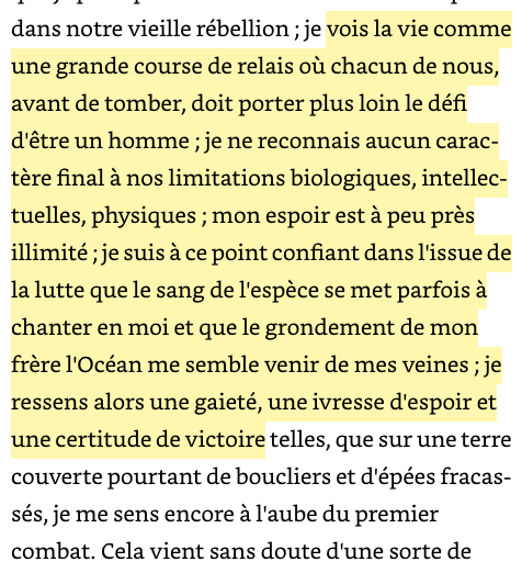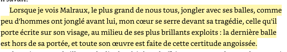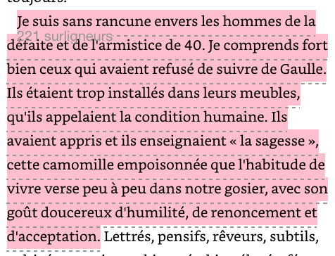Je suis sans rancune envers les hommes de la défaite et de l'armistice de 40. Je comprends fort bien ceux qui avaient refusé de suivre de Gaulle. Ils étaient trop installés dans leurs meubles, qu'ils appelaient la condition humaine. Ils avaient appris et ils enseignaient « la sagesse », cette camomille empoisonnée que l'habitude de vivre verse peu à peu dans notre gosier, avec son goût doucereux d'humilité, de renoncement et d'acceptation.