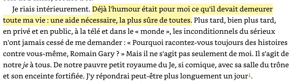 Déjà l'humour était pour moi ce qu'il devait demeurer toute ma vie : une aide nécessaire, la plus sûre de toutes.