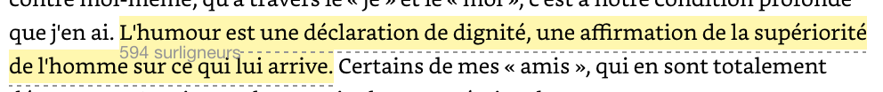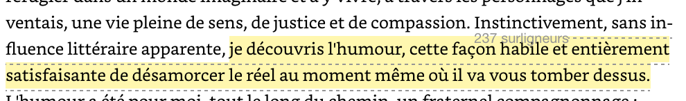 je découvris l'humour, cette façon habile et entièrement satisfaisante de désamorcer le réel au moment même où il va vous tomber dessus.