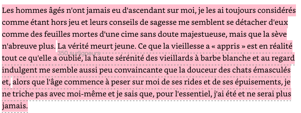 La vérité meurt jeune. Ce que la vieillesse a « appris » est en réalité tout ce qu'elle a oublié, la haute sérénité des vieillards à barbe blanche et au regard indulgent me semble aussi peu convaincante que la douceur des chats émasculés et, alors que l'âge commence à peser sur moi de ses rides et de ses épuisements, je ne triche pas avec moi-même et je sais que, pour l'essentiel, j'ai été et ne serai plus jamais.