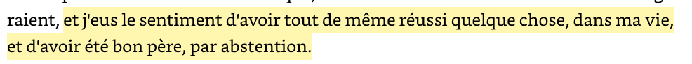 j'eus le sentiment d'avoir tout de même réussi quelque chose, dans ma vie, et d'avoir été bon père, par abstention.