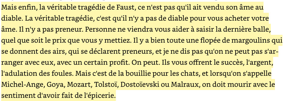 Mais enfin, la véritable tragédie de Faust, ce n'est pas qu'il ait vendu son âme au diable. La véritable tragédie, c'est qu'il n'y a pas de diable pour vous acheter votre âme.