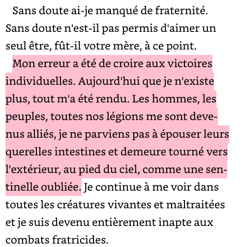 Aujourd'hui que je n'existe plus, tout m'a été rendu. Les hommes, les peuples, toutes nos légions me sont devenus alliés, je ne parviens pas à épouser leurs querelles intestines et demeure tourné vers l'extérieur, au pied du ciel, comme une sentinelle oubliée.