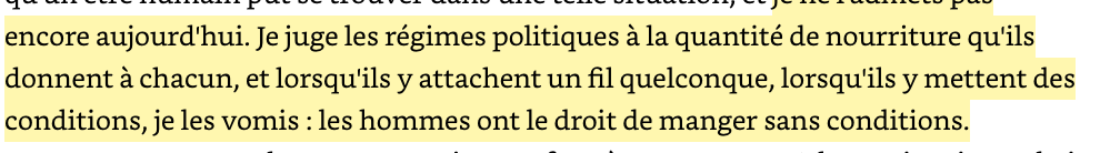 Je juge les régimes politiques à la quantité de nourriture qu'ils donnent à chacun, et lorsqu'ils y attachent un fil quelconque, lorsqu'ils y mettent des conditions, je les vomis : les hommes ont le droit de manger sans conditions.
