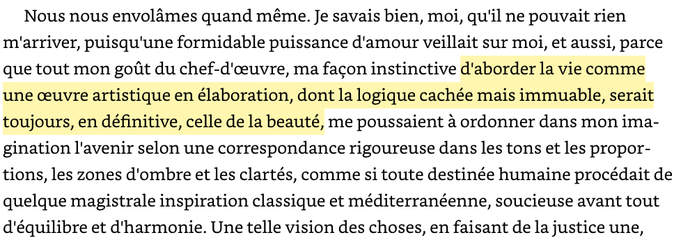 Parce que tout mon goût du chef-d'œuvre, ma façon instinctive d'aborder la vie comme une œuvre artistique en élaboration, dont la logique cachée mais immuable, serait toujours, en définitive, celle de la beauté