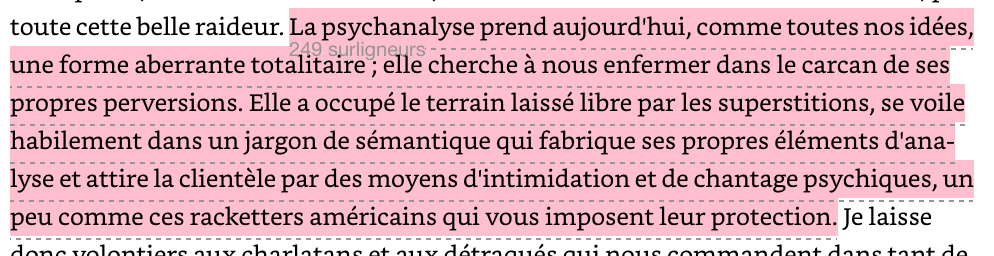 La psychanalyse prend aujourd'hui, comme toutes nos idées, une forme aberrante totalitaire ; elle cherche à nous enfermer dans le carcan de ses propres perversions. Elle a occupé le terrain laissé libre par les superstitions, se voile habilement dans un jargon de sémantique qui fabrique ses propres éléments d'analyse et attire la clientèle par des moyens d'intimidation et de chantage psychiques, un peu comme ces racketters américains qui vous imposent leur protection.