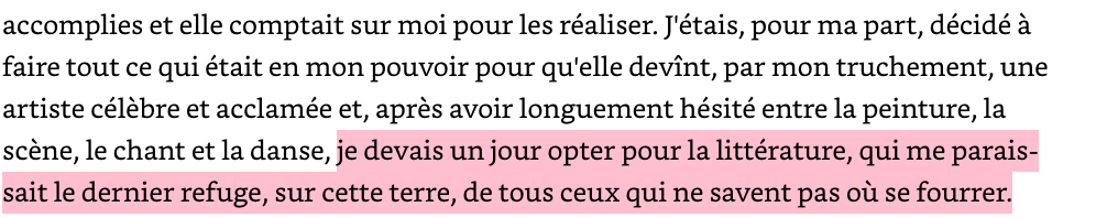 je devais un jour opter pour la littérature, qui me paraissait le dernier refuge, sur cette terre, de tous ceux qui ne savent pas où se fourrer.