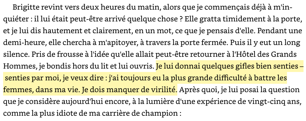 J’ai toujours eu la plus grande difficulté à battre les femmes, dans ma vie. Je dois manquer de virilité.