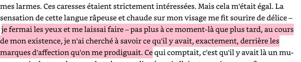 Pas plus à ce moment-là que plus tard, au cours de mon existence, je n'ai cherché à savoir ce qu'il y avait, exactement, derrière les marques d'affection qu'on me prodiguait.