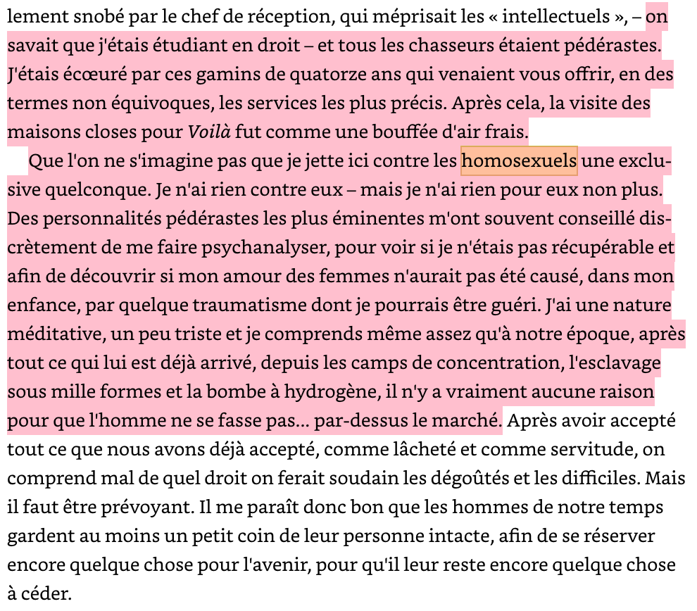 Que l'on ne s'imagine pas que je jette ici contre les homosexuels une exclusive quelconque. Je n'ai rien contre eux – mais je n'ai rien pour eux non plus.